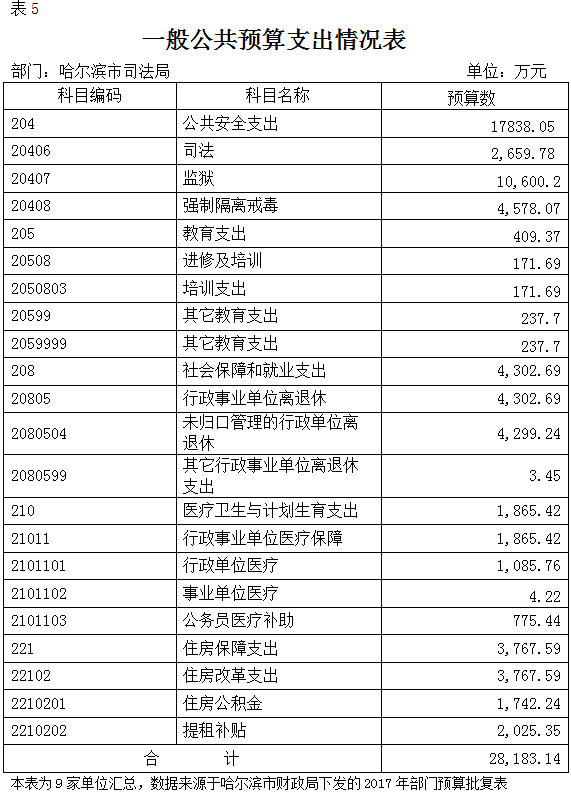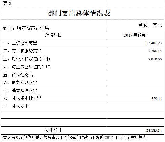 bt365官网2017年预算支出总计28,183.14万元。其中:公共安全支出17,838.05万元,占总支出的63.3%,反映为维护社会公共安全方面的支出,包括司法、监狱、强制隔离戒毒支出;教育支出409.37万元,占总支出的1.5%,主要为哈尔滨市政法干警学校事务支出,市司法局以及市属监狱、戒毒单位职工教育培训支出;社会保障和就业支出4,098.03万元,占总支出的15.3%,主要为离退休人员费以及抚恤金支出等;医疗卫生支出1,865.42万元,占总支出的6.6%,反映各单位基本医疗保险缴费支出,以及服刑人员参加新农合支出;住房保障支出3,767.59万元,占总支出的13.3%,反映各单位用于住房方面的支出,主要为住房公积金和提租补贴。