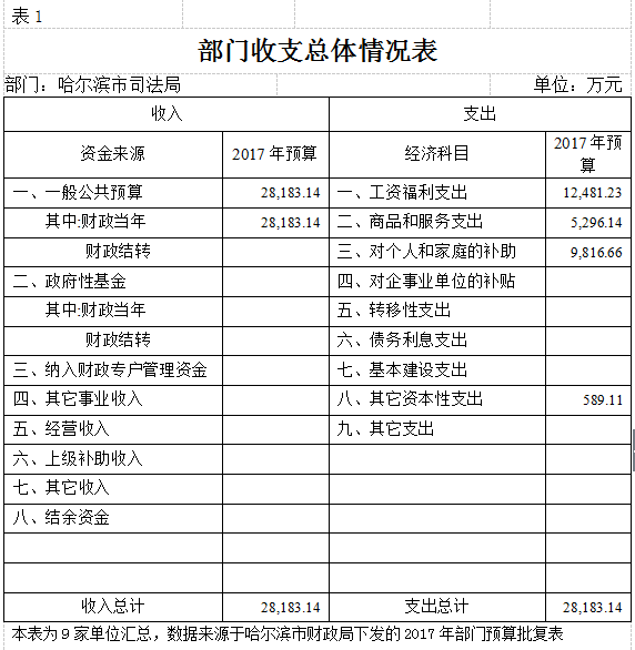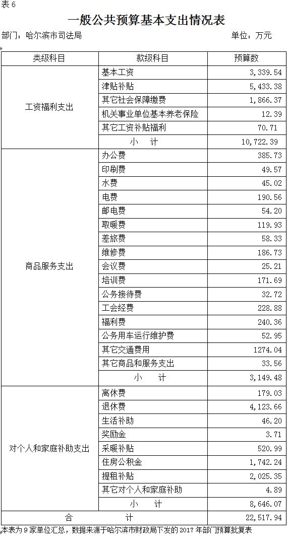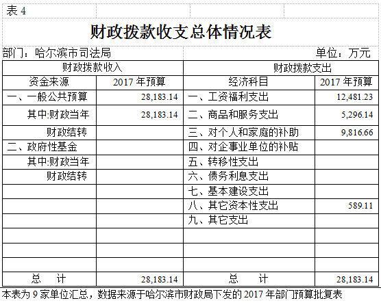 bt365官网2017年预算支出总计28,183.14万元。其中:公共安全支出17,838.05万元,占总支出的63.3%,反映为维护社会公共安全方面的支出,包括司法、监狱、强制隔离戒毒支出;教育支出409.37万元,占总支出的1.5%,主要为哈尔滨市政法干警学校事务支出,市司法局以及市属监狱、戒毒单位职工教育培训支出;社会保障和就业支出4,098.03万元,占总支出的15.3%,主要为离退休人员费以及抚恤金支出等;医疗卫生支出1,865.42万元,占总支出的6.6%,反映各单位基本医疗保险缴费支出,以及服刑人员参加新农合支出;住房保障支出3,767.59万元,占总支出的13.3%,反映各单位用于住房方面的支出,主要为住房公积金和提租补贴。