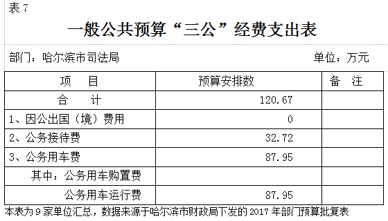 bt365官网2017年“三公”经费120.67万元,比上年减少56.5%,其中:本年因公出国(境)费用为0万元,与上年相同;公务接待费32.72万元,比上年增加5.4%,增加原因为公务接待费计算基数增加;公务用车费87.95万元,比上年减少64.3%。减少原因为:加大“三公”经费控制力度,严控一般性支出;黑龙江省东风监狱、黑龙江省黎明监狱、黑龙江省玉泉监狱、哈尔滨市万家强制隔离戒毒所、哈尔滨市前进强制隔离戒毒所、哈尔滨市社区矫正支队、bt365官网强制隔离戒毒集训队7家单位实行车改,导致公务用车费大幅减少。